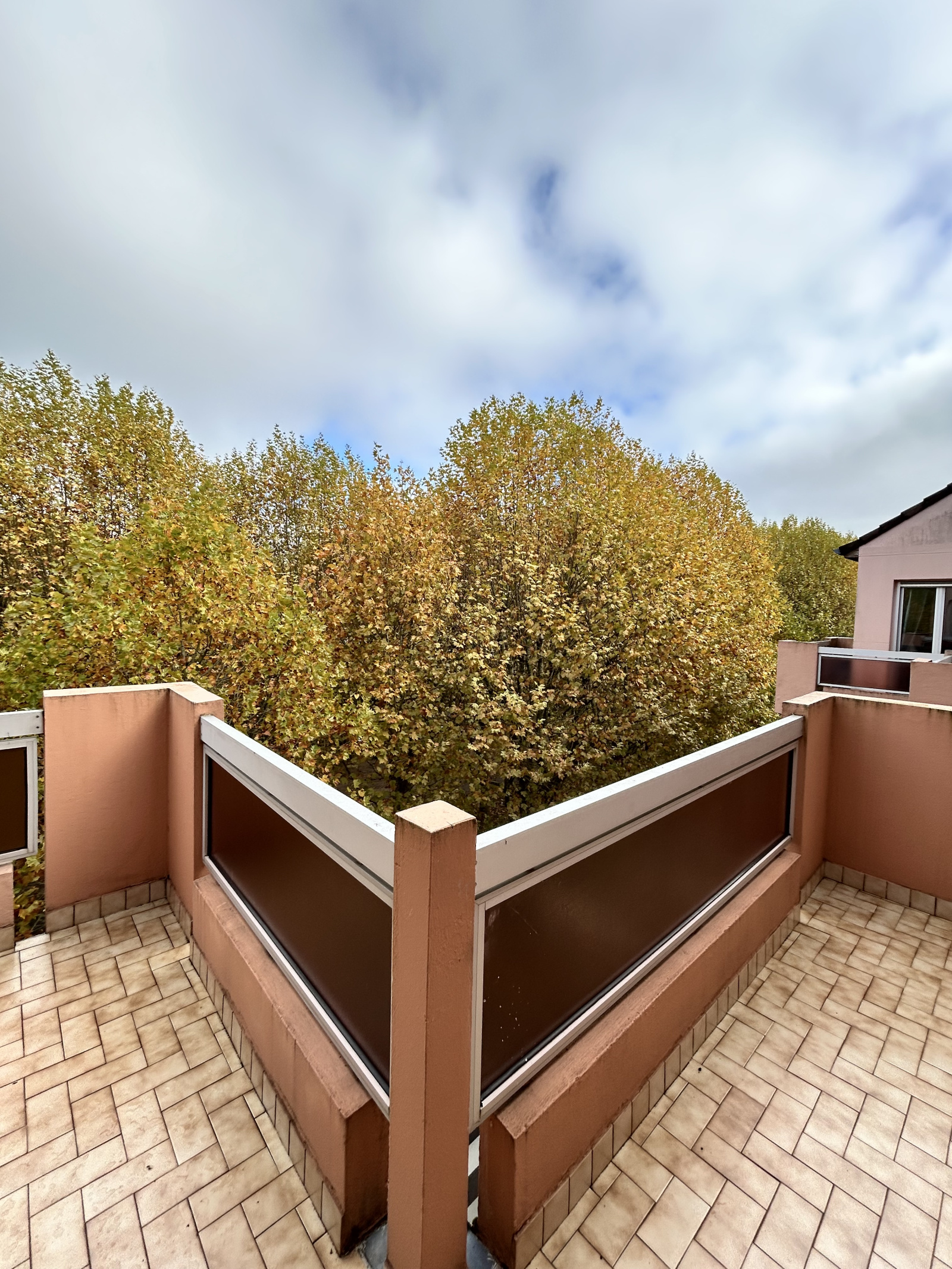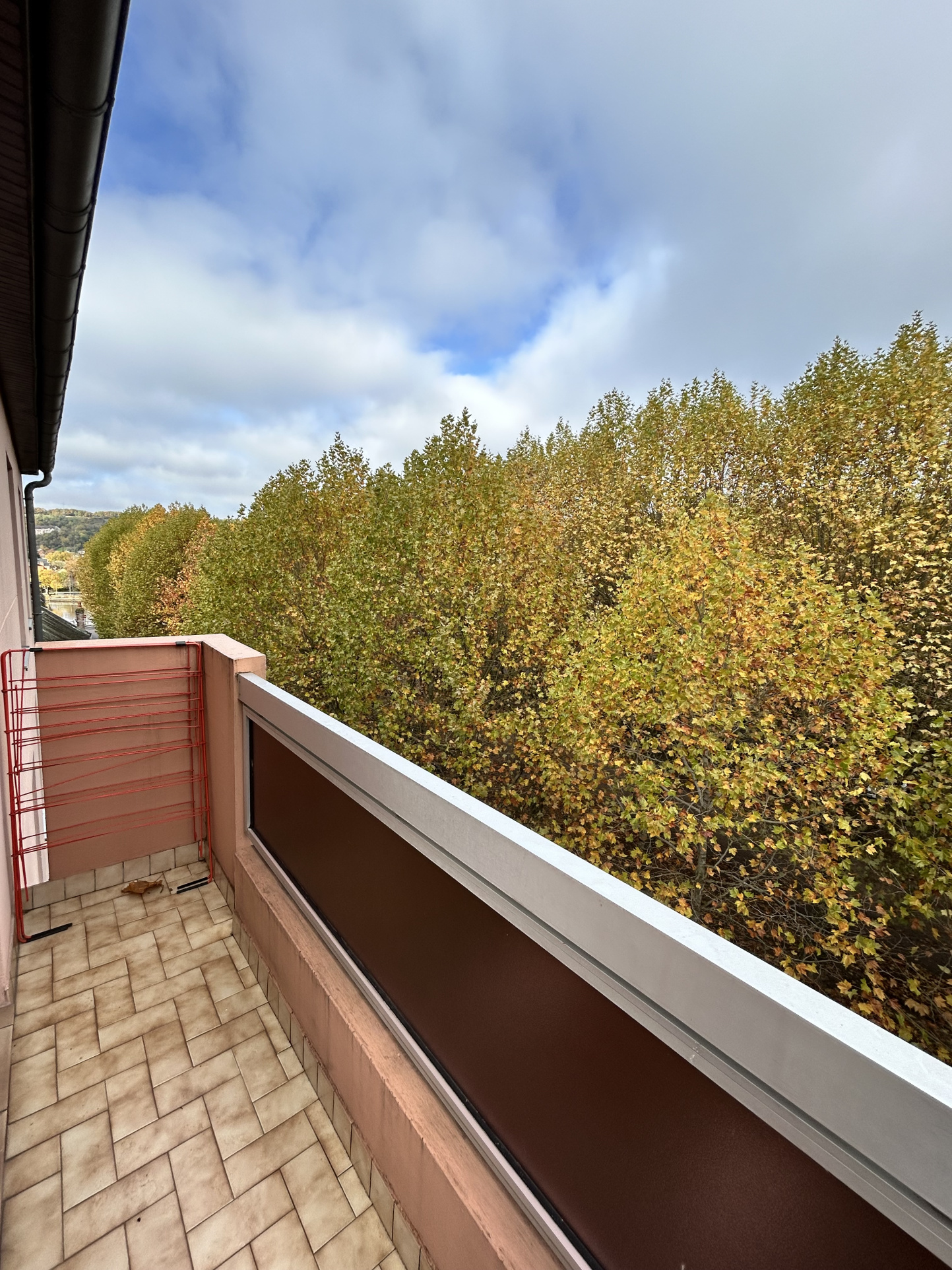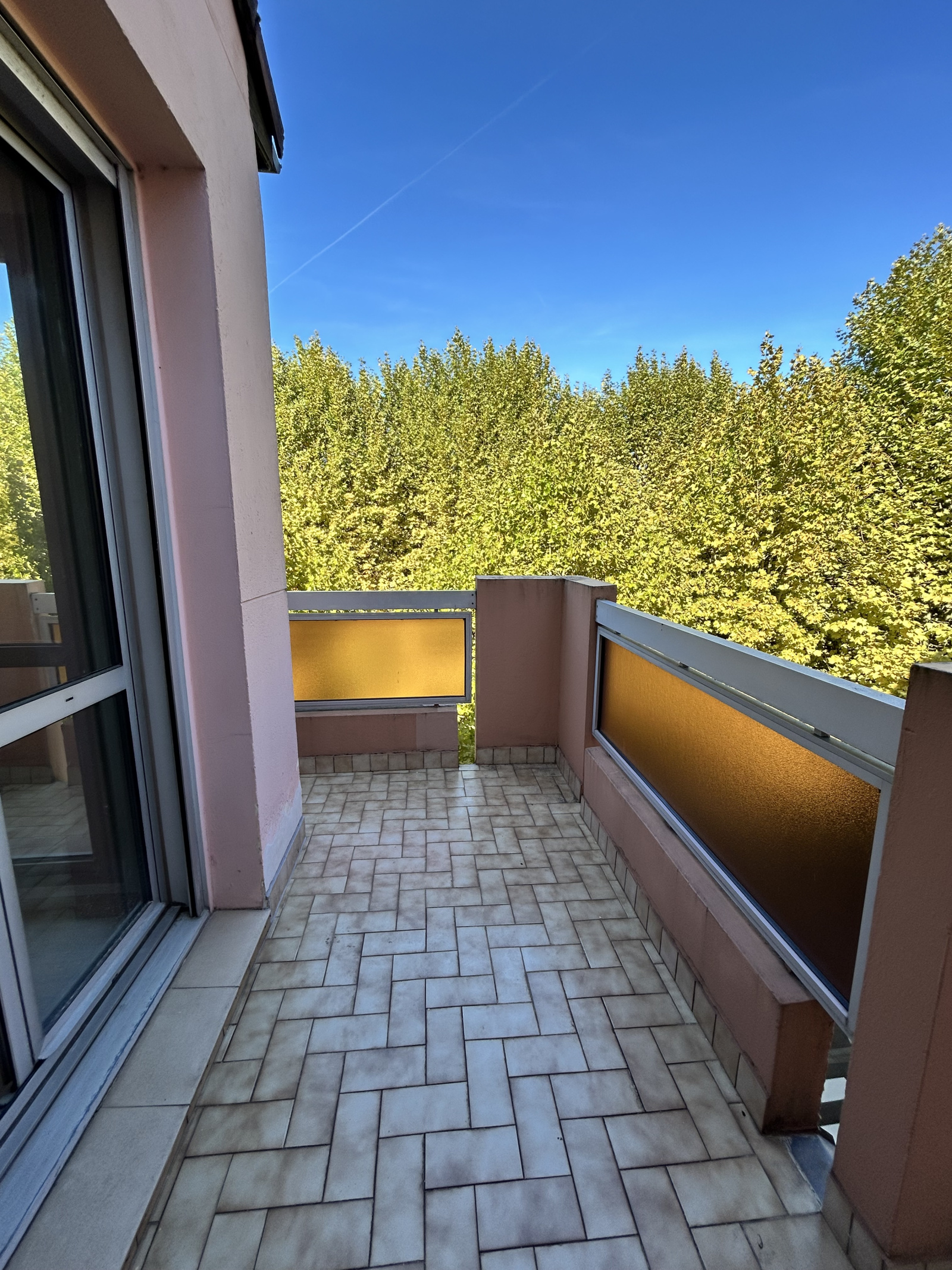 Le balcon est accessible depuis le salon, la cuisine et la chambre, offrant une belle luminosité et un cadre agréable.