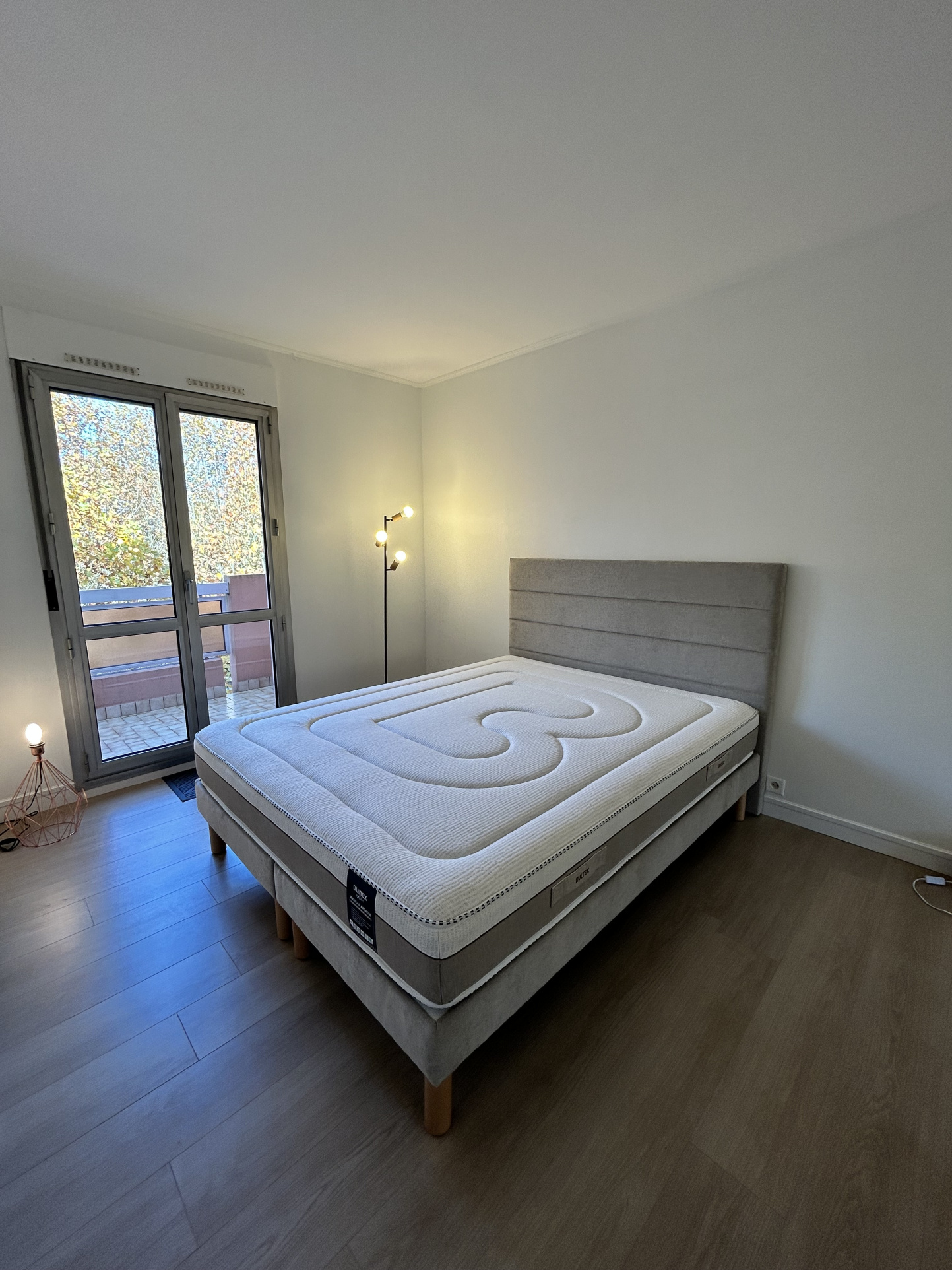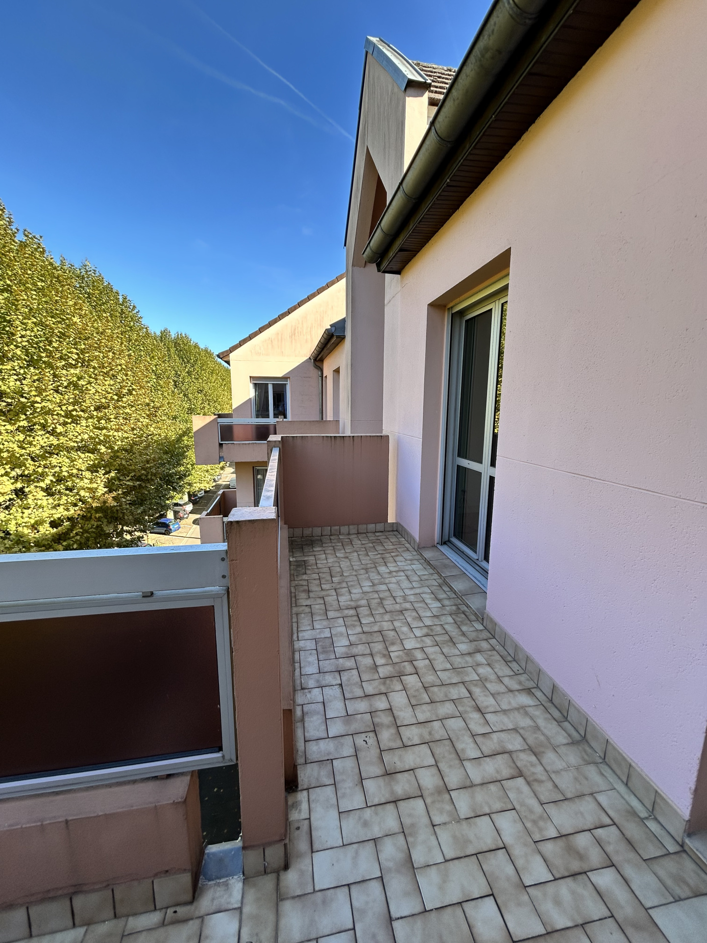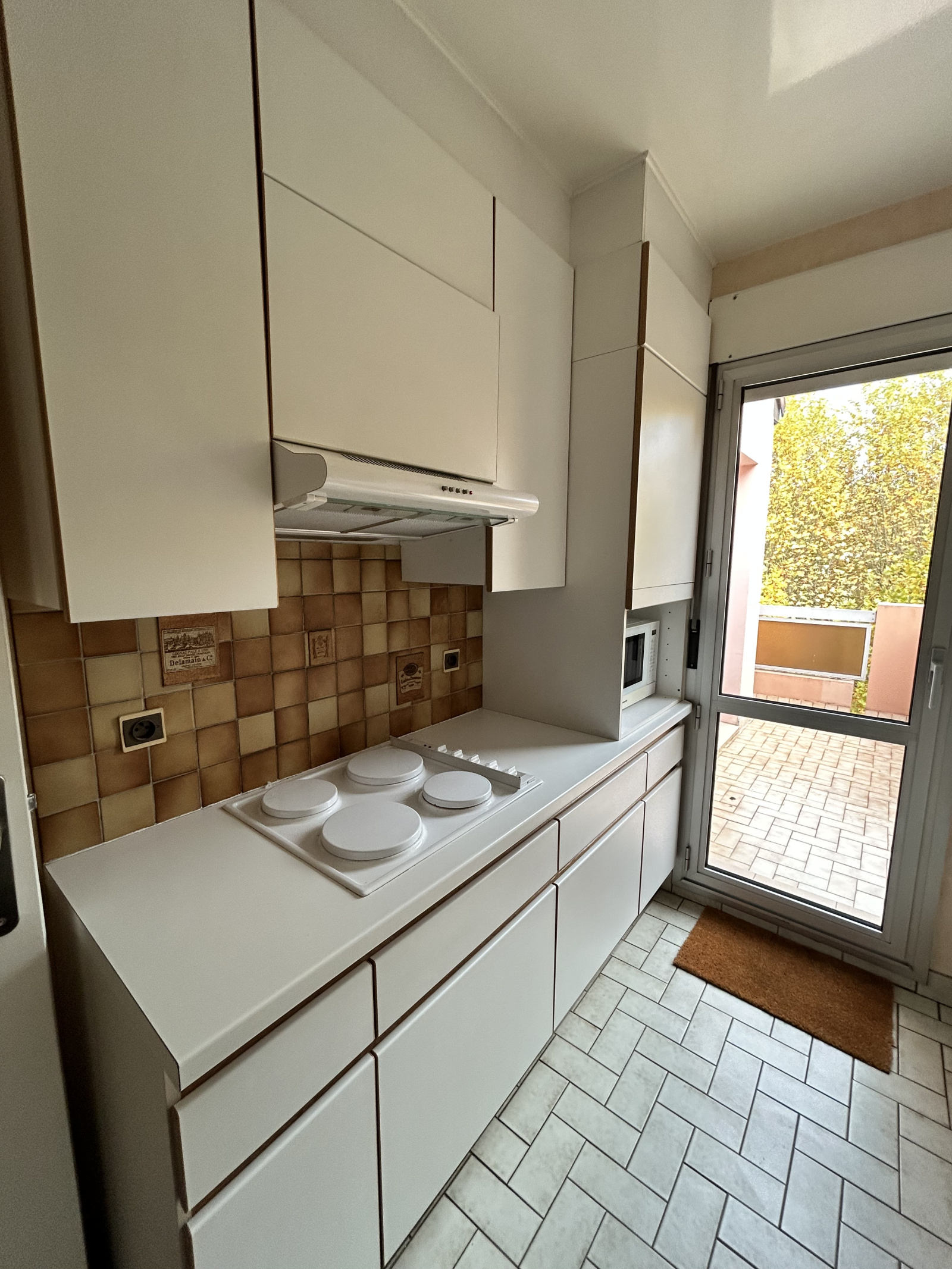 Le balcon est accessible depuis le salon, la cuisine et la chambre, offrant une belle luminosité et un cadre agréable.
