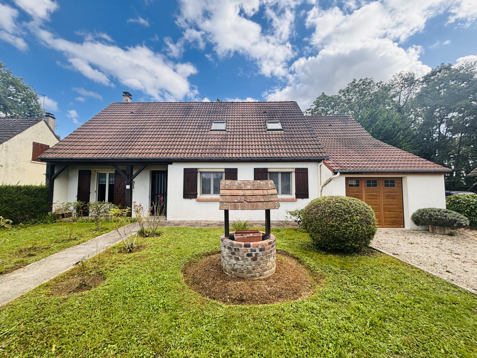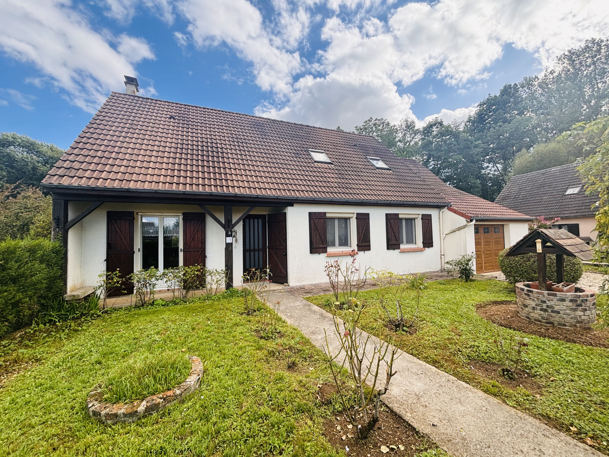 Maison de plain pied composée d'une entrée desservant une salle de séjour traversante avec une cheminée, une cuisine séparéeavec accés terrasse, un dégagement desservant trois chambres, une salle d'eau, un wc, une chaufferie. Au premier étage: un palier pouvant servir de bureau, un dégagement desservant un wc, deux chambres, des combles non aménageables. un garage avec porte automatique.