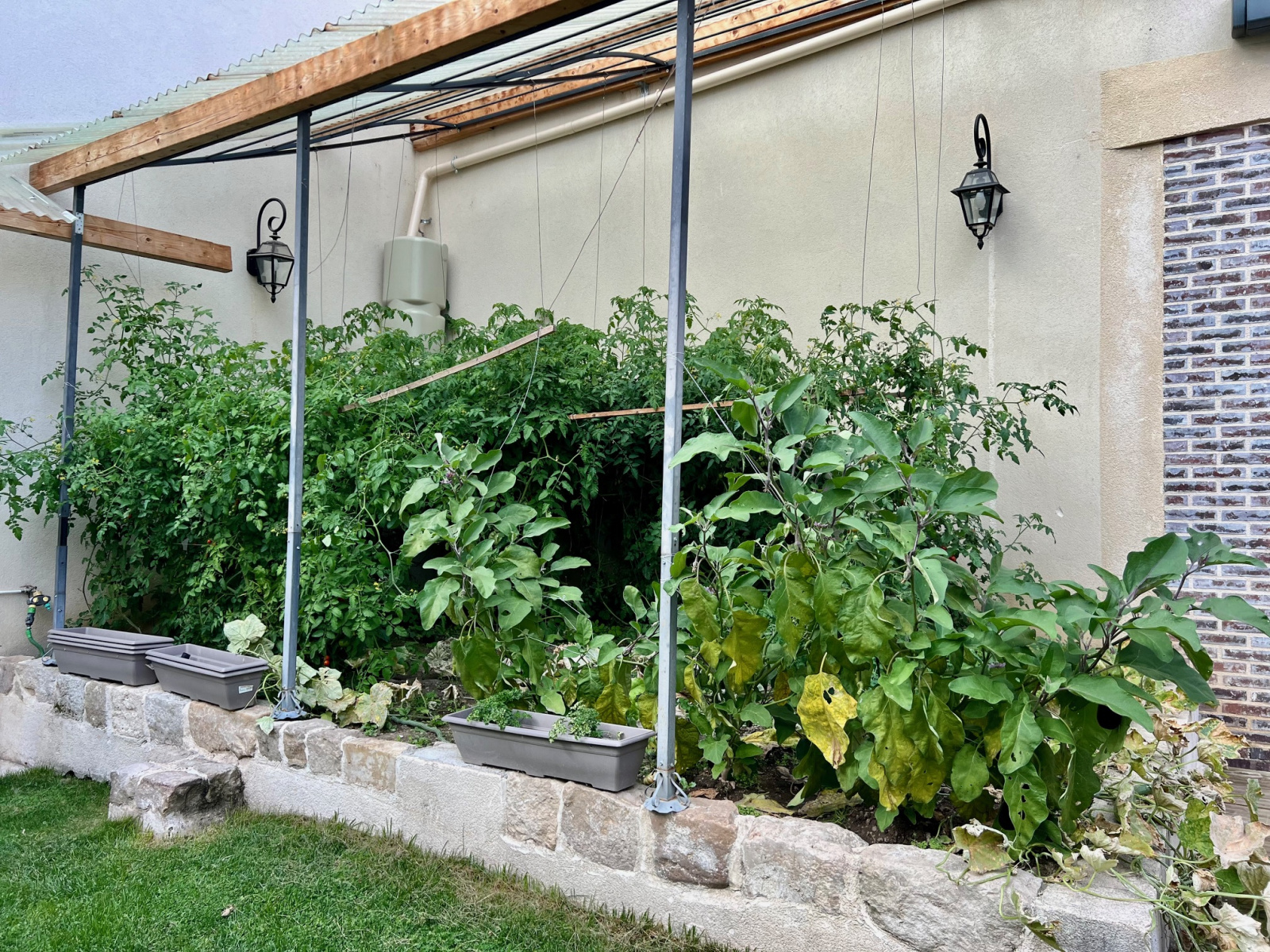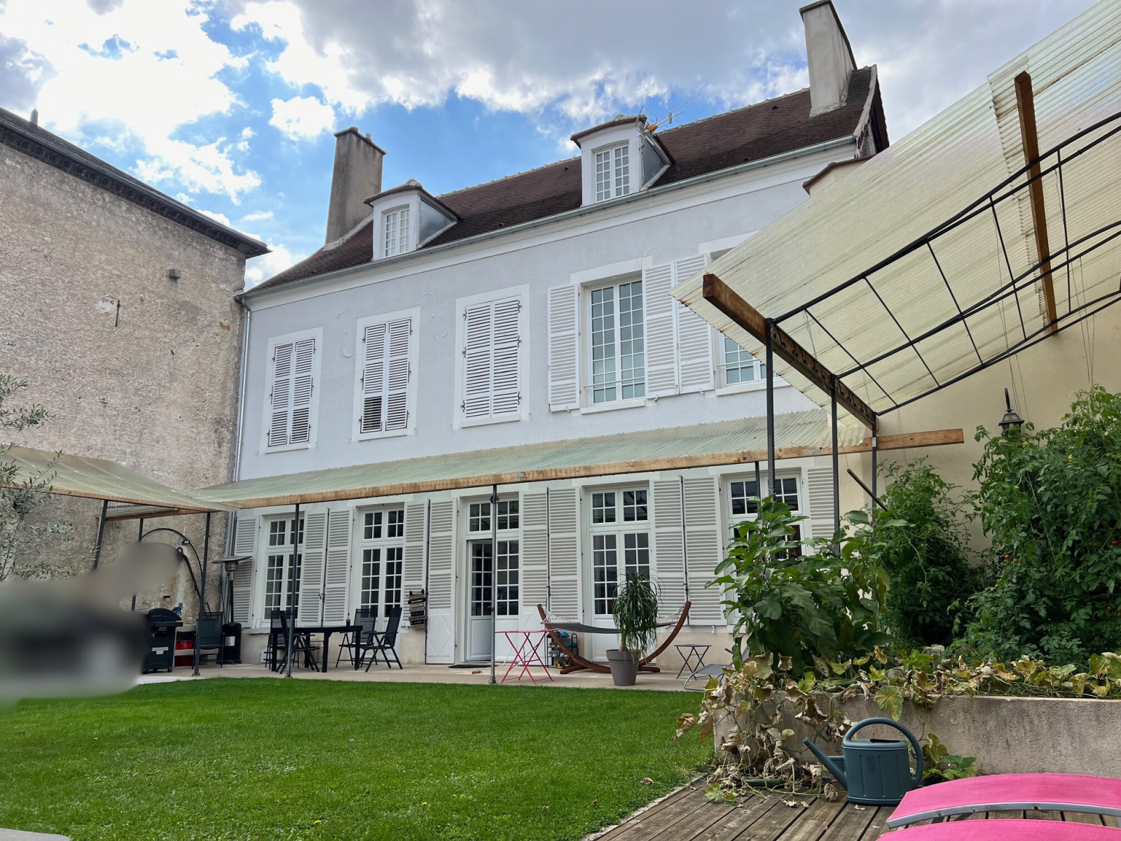 Jardin clos de purs et ensoleillé. Portail automatique et stationnement des voitures abrité. Cour pavées sur le devant.