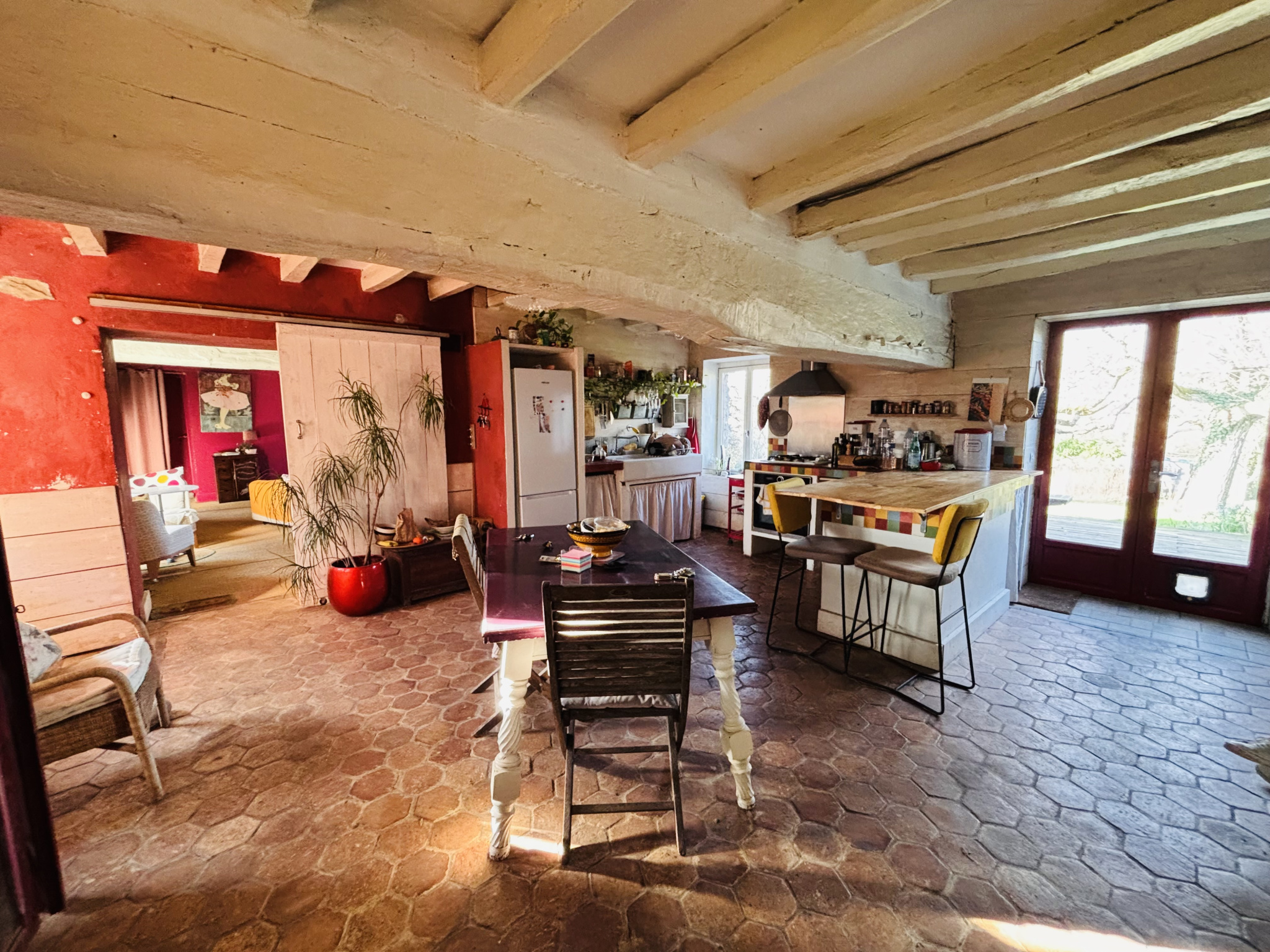 - Cuisine aménagée avec tommettes anciennes, ouverte sur un espace salle à manger convivial, donnant directement sur une grande terrasse en bois et le jardin.