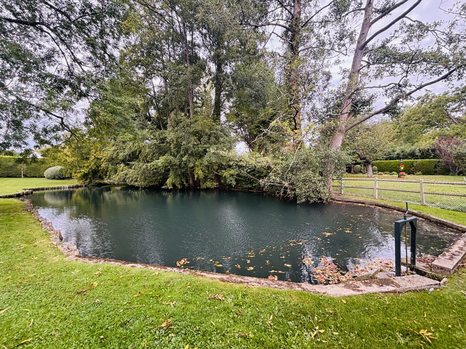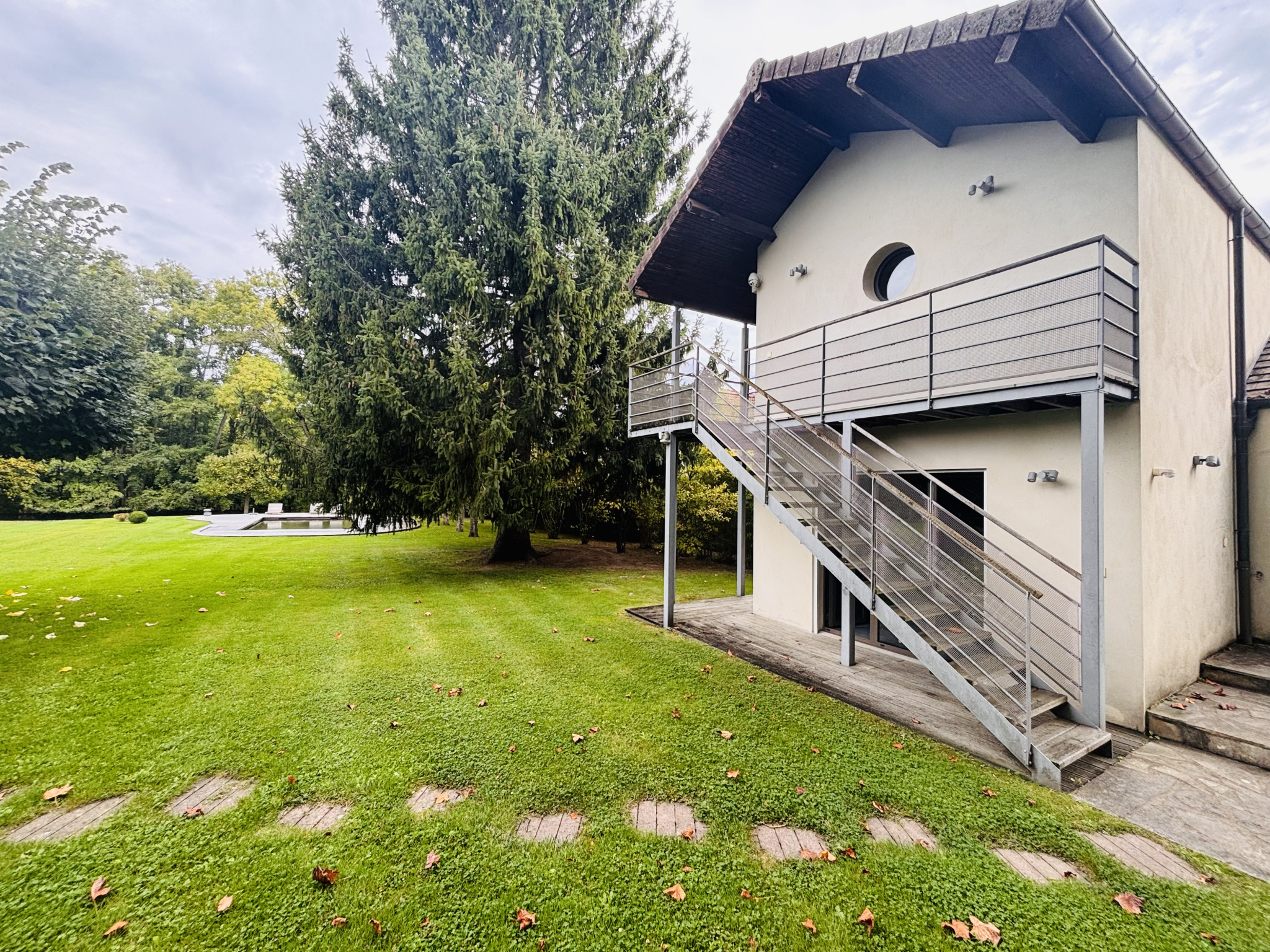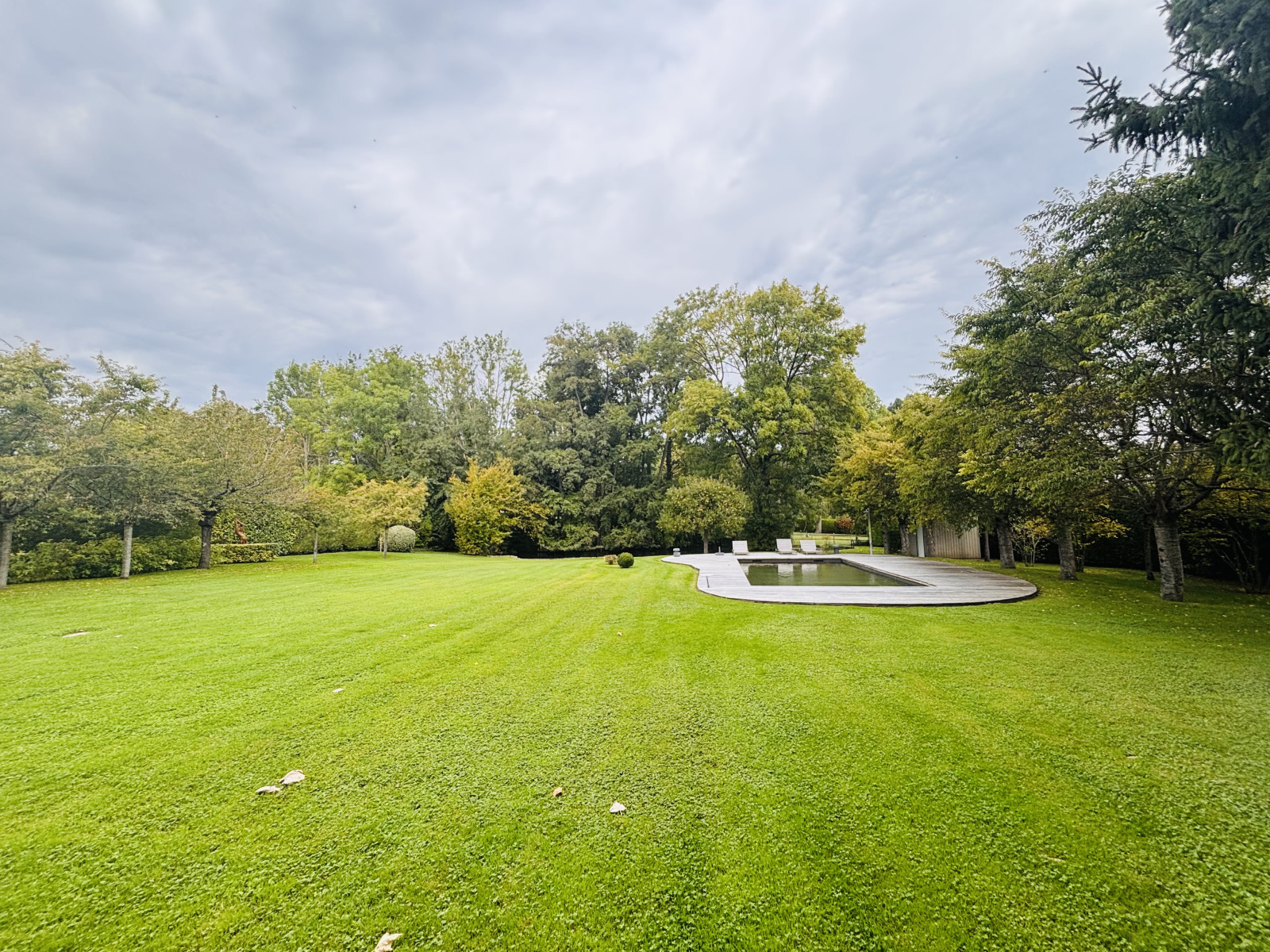 Le jardin, magnifiquement paysagé, abrite une piscine en bois creusée avec fond mobile permettant de la transformer en terrasse, un local technique, ainsi qu’un charmant étang.