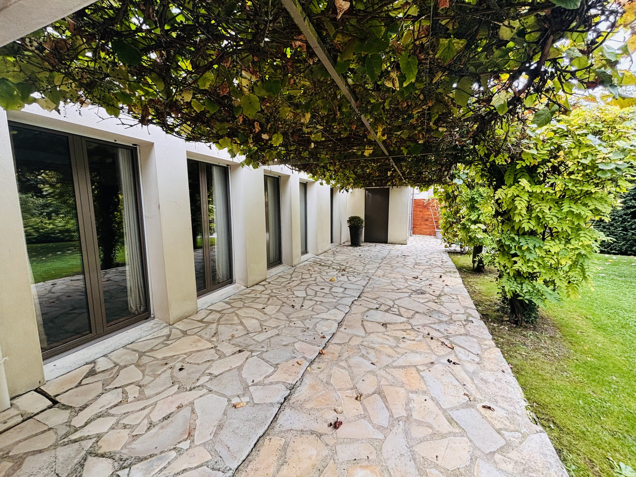Dès l'entrée, une belle terrasse couverte par une treille de vigne vous accueille. Le rez-de-chaussée se compose d’un vaste salon-séjour parqueté avec cheminée, d’une cuisine séparée et équipée, d’une suite parentale avec salle d’eau, de WC séparés, de grands rangements sur mesure en bois massif et d’une seconde chambre pouvant également servir de bureau.