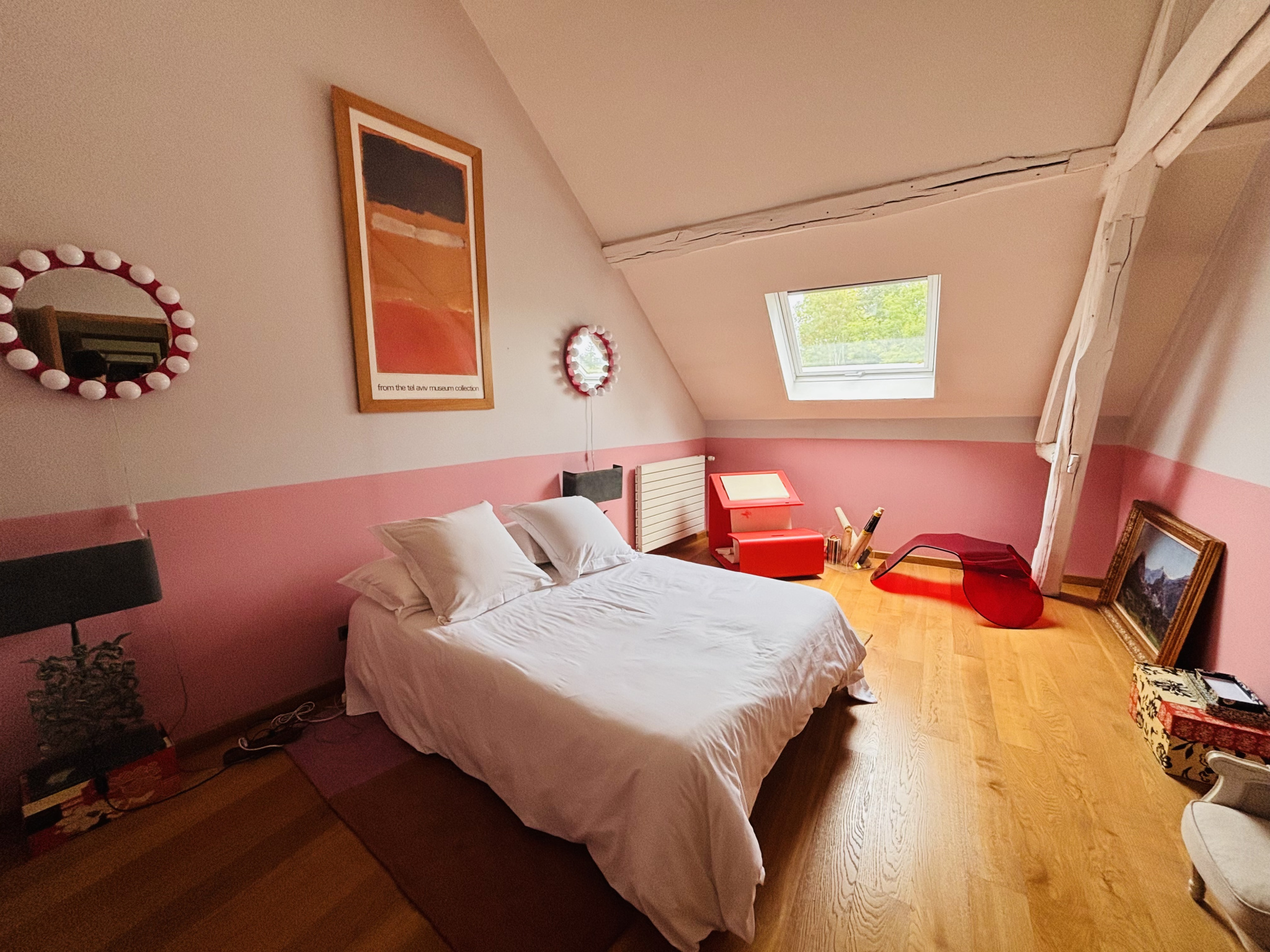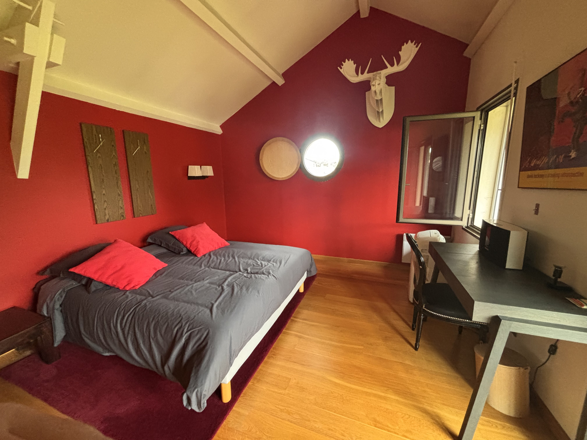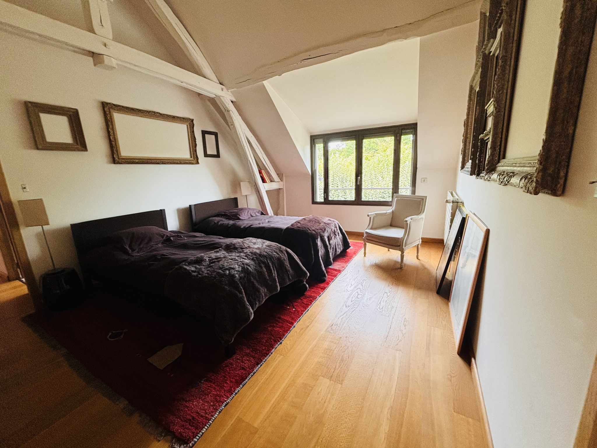 À l’étage, un bel escalier mène à un palier desservant une grande pièce de 28 m² utilisée comme home cinéma, deux chambres, une seconde salle d’eau avec douche et des WC séparés.