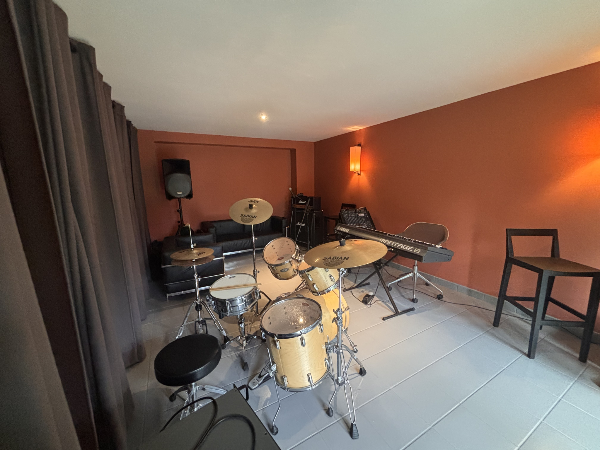 La dépendance offre une grande pièce en rez-de-chaussée, actuellement utilisée comme salle de musique, et un étage aménagé en studio avec chambre, kitchenette et salle d’eau. Elle dispose aussi de son propre garage.