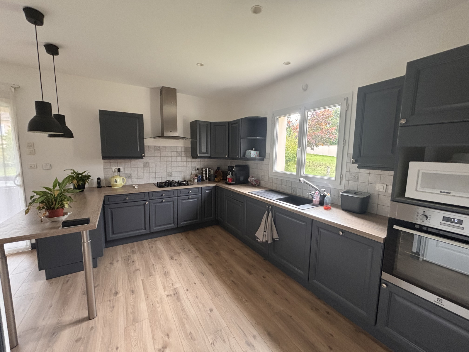 Au rez-de-chaussée, vous trouverez une entrée, une grande cuisine aménagée, un cellier, une salle de bains avec baignoire, douche et double vasque, ainsi qu’un WC indépendant.