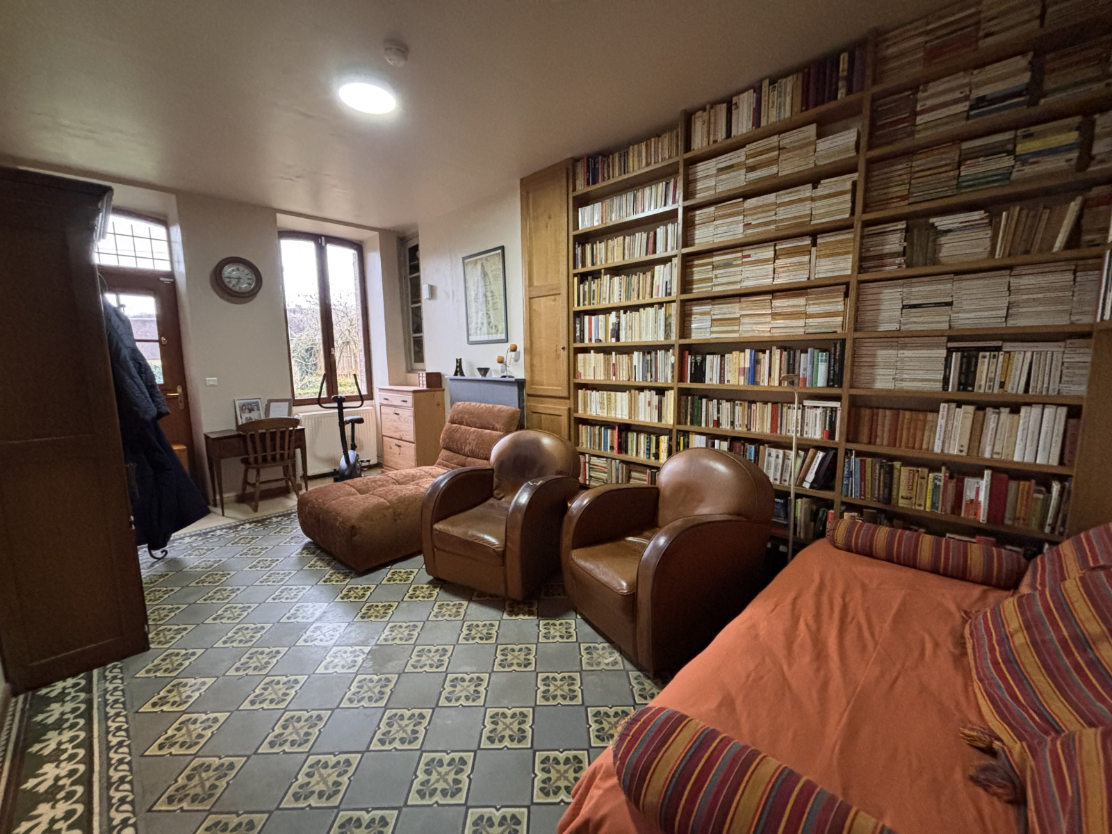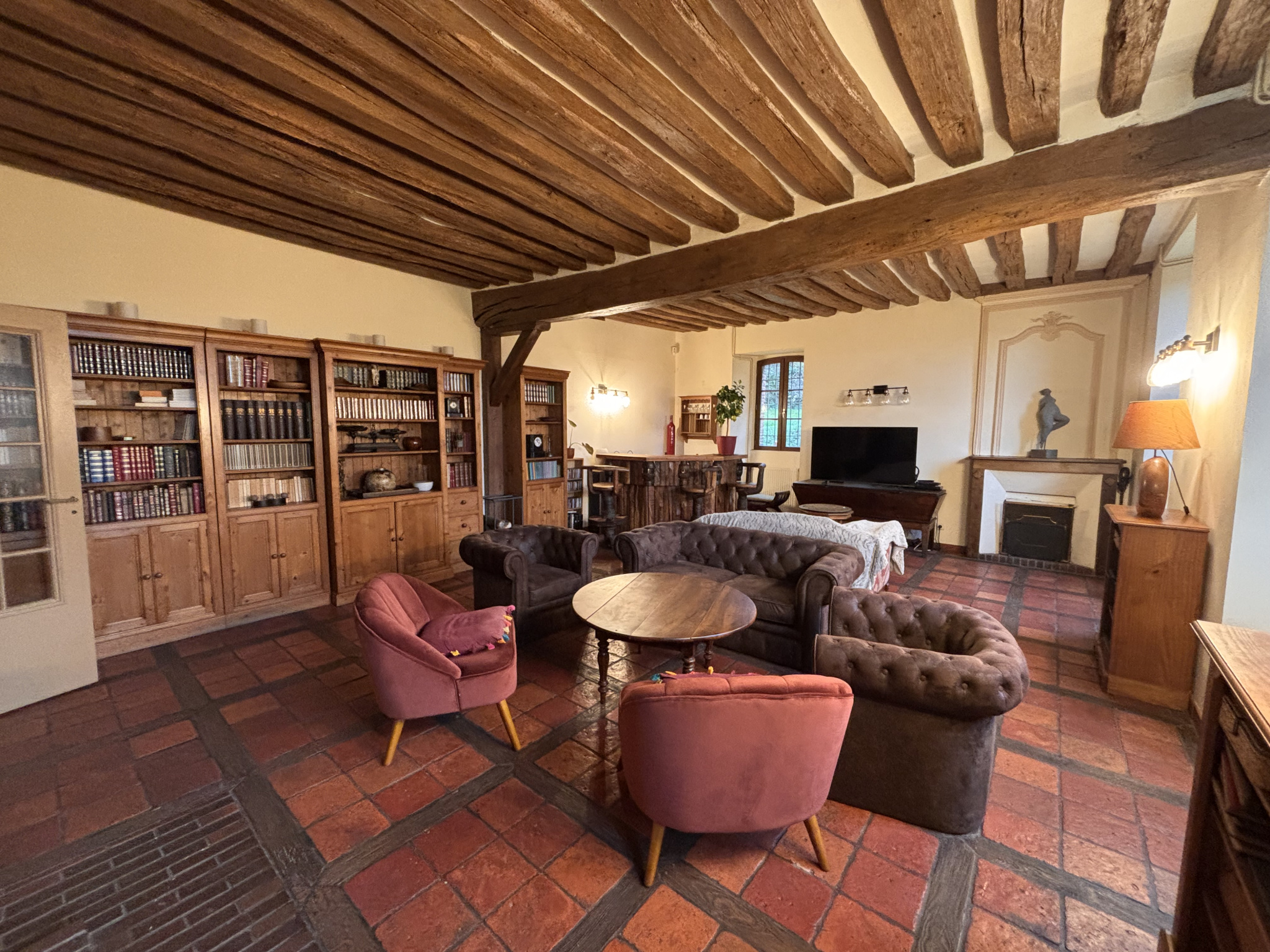 Dès l’entrée, vous découvrirez un vaste séjour de 43 m², habillé de tomettes anciennes et agrémenté d’un poêle à bois. La cuisine aménagée, dotée d’une cheminée. Une ravissante bibliothèque avec carreaux de ciment, des WC et une buanderie complètent le rez-de-chaussée.